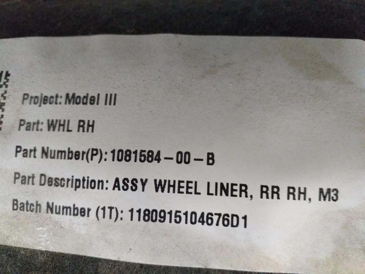 Right rear fender liner for the Tesla Model 3. This product is designed to effectively protect the electric vehicle from dirt, mechanical damage, and corrosion. This product is genuine, like all Tesla parts available in our online store. The right rear fender liner is made of durable material that is resistant to wear and damage. The manufacturer strongly recommends purchasing only genuine Tesla parts with branded markings. This ensures their quality and proper operation. Please note that this part is designed for the Tesla Model 3 electric vehicle. Part number and full name: ASY WHEEL LINER, RR RH, 1081584-00-D.